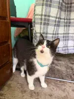 Ganache is a young and very affectionate cat who absolutely loves people. He is calm, purrs a lot, and makes funny little squeaky sounds — we even thought about naming him “Chick” because of it.