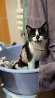 In March 2026, it was officially decided — all hearts surrendered, and Syrnik found her loving home. Now she happily travels on her family’s shoulders and heads, sleeps right next to them or on their chest, and gets into all kinds of playful mischief. We regularly receive updates from her and couldn’t be happier.