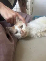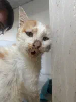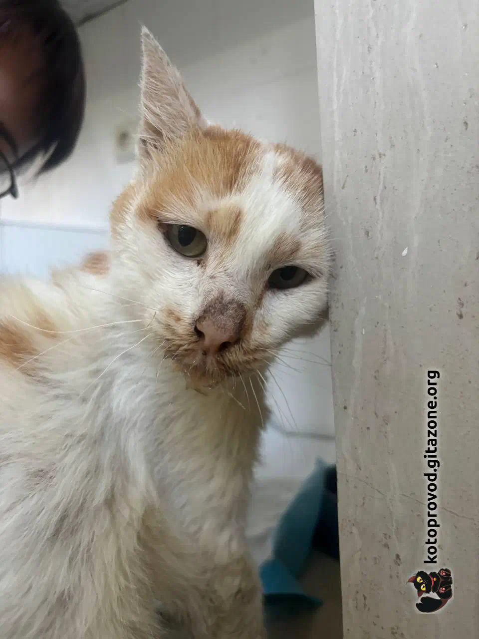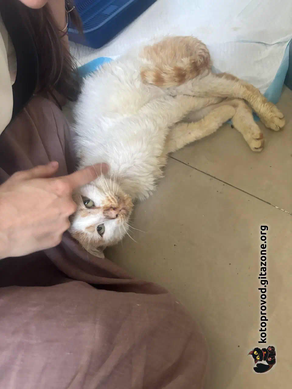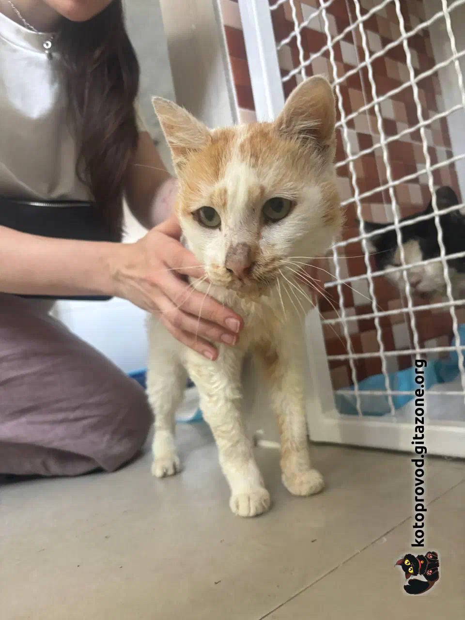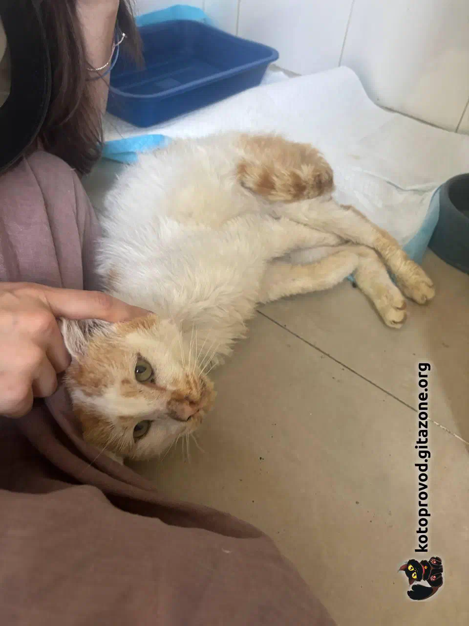 Мартини (бело-рыжий) — мальчик, возраст пока не понятен. Сдали анализы крови, сделали УЗИ — ясности с диагнозом пока нет. Есть несколько гипотез, одна хуже другой. Факты: поджелудочная, почки, печень — деформированы, нарушены структуры. Кровь по показателям намекает, что проблемы с кроветворением. Меньшее из всех его проблем — застарелая травма таза, из-за которой он с трудом передвигается. Вероятно, испытывает боль.